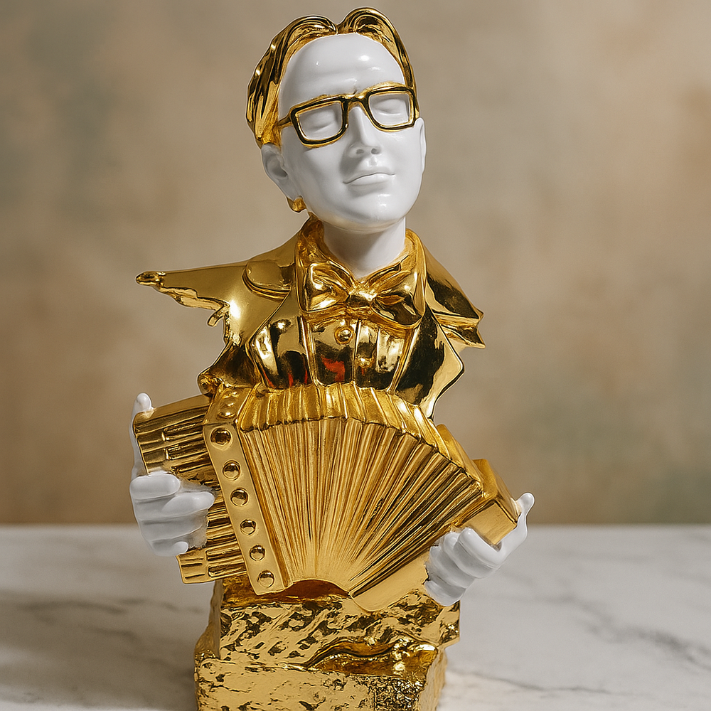 The beauty of art, music, and decor deserve a celebration! This stunning Accordion Musician Bust Showpiece will surely do that. Perfectly positioned between abstract and realism, this piece of functional art shows a very fashionable male musician contemplating playing the accordion. In this nice décor piece, contemporary art meets the art of music and will make the perfect addition to collectors and music lovers alike. This decorative musician figurine is delicately crafted, featuring a shiny white ornamental finish, opulent golden accents on the clothing, hair, glasses, and instrument, and a textured gold base that enhances its elegance. This musician ornament will look extraordinary in your home, music lounge, café, home studio, or office. The modern music lover sculpture décor is a fantastic expression of creativity, talent, and artistic lifestyle that serves as a lovely reminder of the timelessness of art and emotion. A shelf, a console table, a corner of the music room, wherever displayed, use this musician figurine as a display item, reminding ourselves of our fondness, passions, and interests that shape our lifestyles and living areas, while providing a strong significance and great visual benefit! Made of durable resin, the figurine has long-lasting quality while maintenance is simple: just a soft dry cloth to maintain a glossy, gleaming finish. While it is a decorative statue of style, an accordion musician bust showpiece is also a great gift for musicians, music lovers, art enthusiasts, or as housewarming or anniversary gift. Its modern yet nostalgic styling allows the statue to mix with practically any decor style - from modern minimalist to rustic vintage! Marry style and melody in this charming work of art where the heart and the eyes meet.