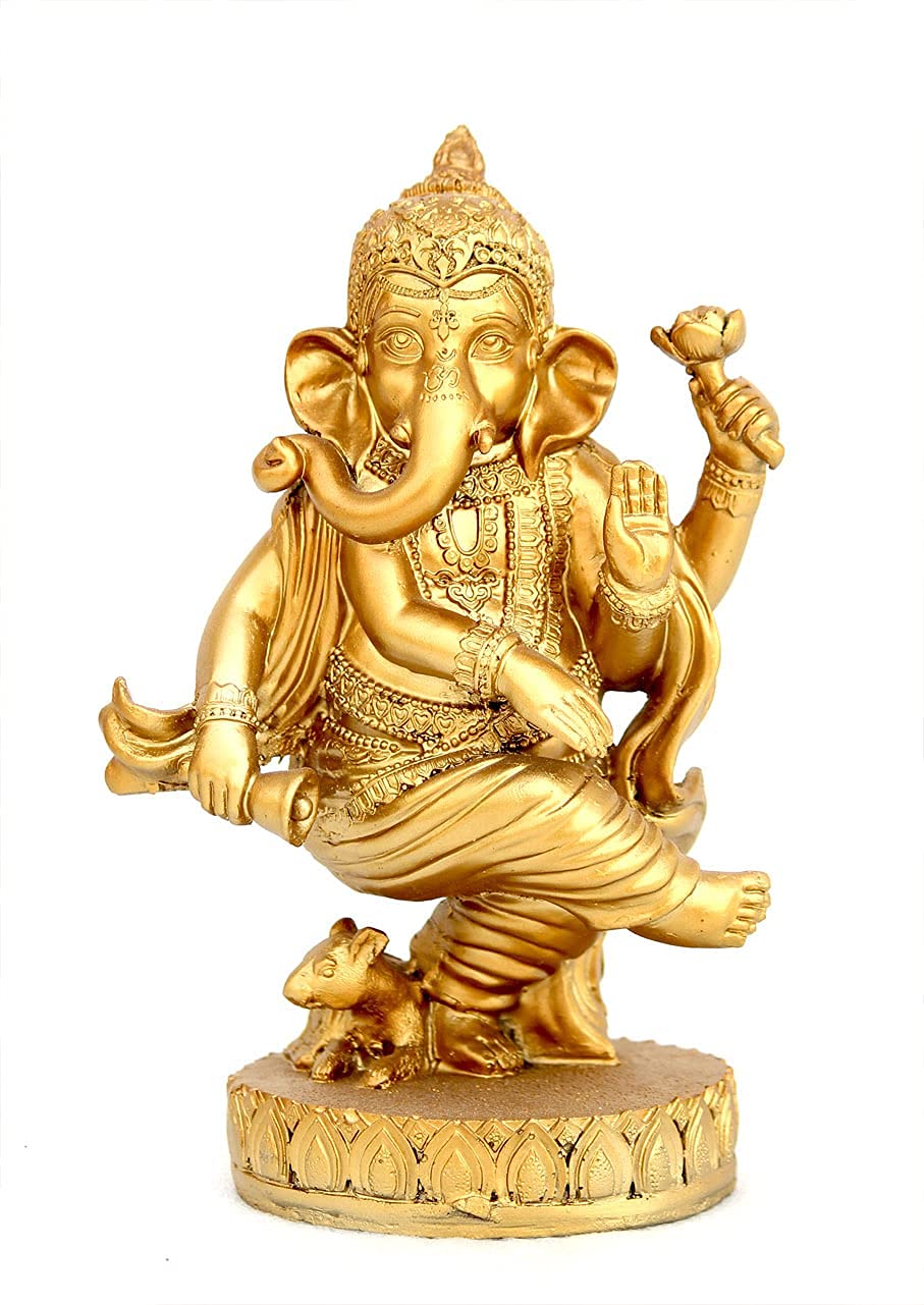 Elevate your home s ambiance with this Beautiful Golden Finish Ganesha Showpiece, showcasing Lord Ganesha in an elegant dancing pose. Crafted with exquisite detail, this masterpiece captures the grace and charm of Lord Ganesha s divine movements, symbolizing joy, success, and positivity.The statue is adorned with a shimmering golden finish that enhances its visual appeal and adds a touch of opulence to any space. Made from high quality material, the smooth texture and intricate carvings highlight the fine craftsmanship, making it a timeless decorative piece.