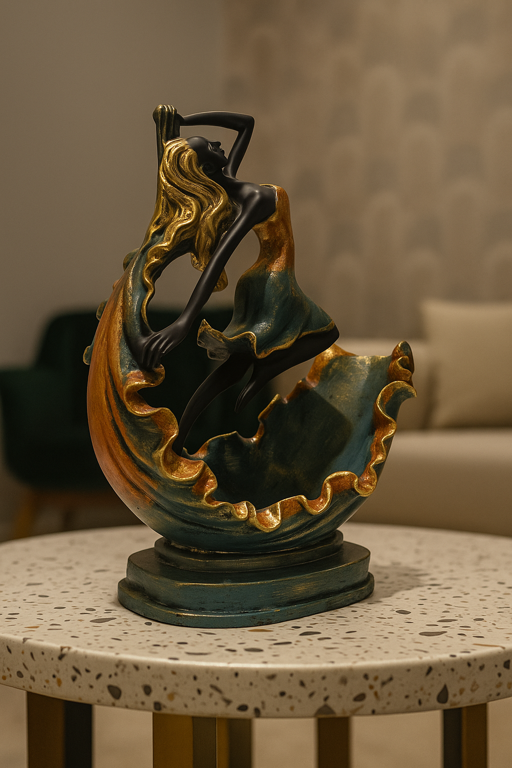 I received this elegant dancing lady figurine as a wedding gift, and I named her Aishani. Her graceful pose and the teal-bronze-gold finish bring sophistication and a lingering sense of serenity to my lounge. I now use her little bowl to hold fresh potpourri—she’s both beautiful and practical. Truly elevates my décor!