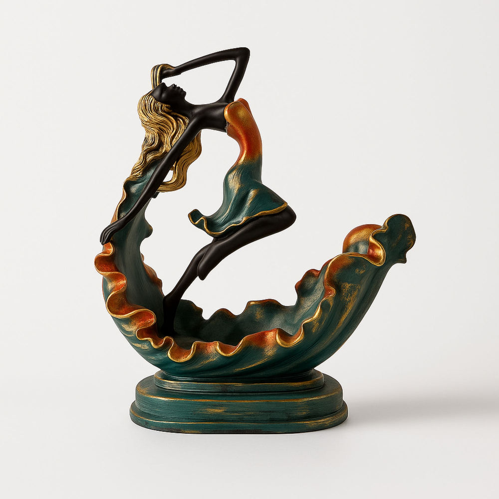 The figure features a sculptured woman in a dance position, adorned with flowing clothing designs in teal with bronze accents and golden embellishments. The curvy base of this piece has a design that resembles a bowl, making it not just an interesting decorative item; it has a practical storage component that will work as a decorative key holder, jewelry holder, potpourri holder, or you can use it as a small holder for dry fruits for when you have guests over.