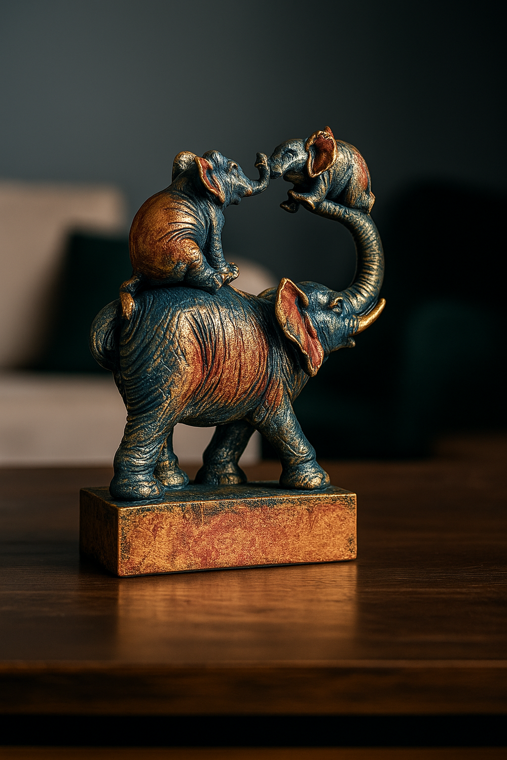 Elephants have long been regarded as symbols of strength, wisdom, and good fortune. This artistic set captures that symbolism beautifully, with each figurine posed differently — one featuring a single majestic elephant, another carrying a playful calf on its back, and the third showcasing an impressive stacked design of multiple elephants. Each piece is mounted on a sturdy square base with a rustic gold finish, enhancing the traditional yet contemporary look.
