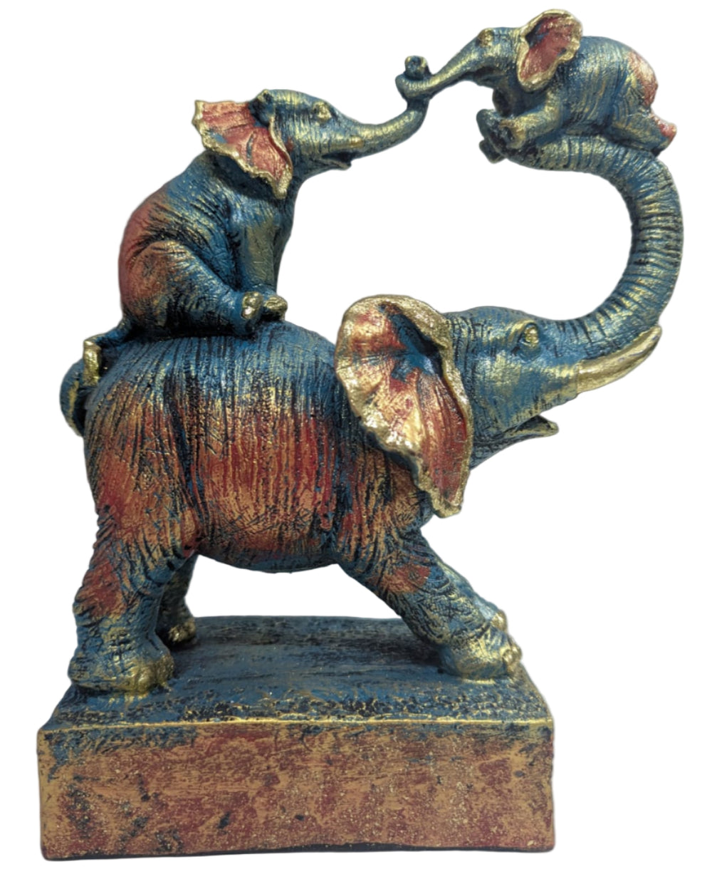 Add charm, artistry, and cultural symbolism to your home with this stunning Stacked Elephant Statue Decor. This collection features three uniquely designed elephant sculptures in vibrant, antique-style finishes with shades of gold, copper, and blue. Crafted with precision and attention to detail, these colorful elephant showpieces bring a lively yet elegant touch to your décor.