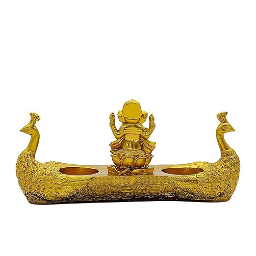 Illuminate your space with divine grace using this Ganesha Peacock Candle Holder, a stunning blend of spirituality and artistry. Handcrafted from high quality gold plated metal, this piece features Lord Ganesha with an intricately designed peacock, symbolizing beauty, wisdom, and enlightenment. nPerfect for festive occasions, puja rituals, or everyday spiritual ambiance, this candle holder adds a warm glow and sacred charm to any setting. A beautiful gift for Diwali, housewarmings, or spiritual celebrations.