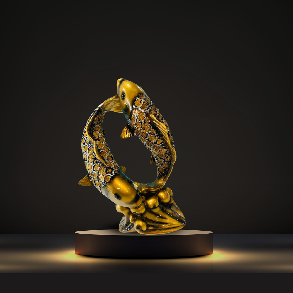 Increase the charm and energy of your living space with this Golden Dual Fish Decor Sculpture, a beautifully crafted showpiece that combines artistic grace with traditional symbolism. Designed in radiant golden hues and made from premium quality resin, this decor piece features two intricately detailed fishes intertwined in fluid motion, embodying prosperity, balance, and abundance.