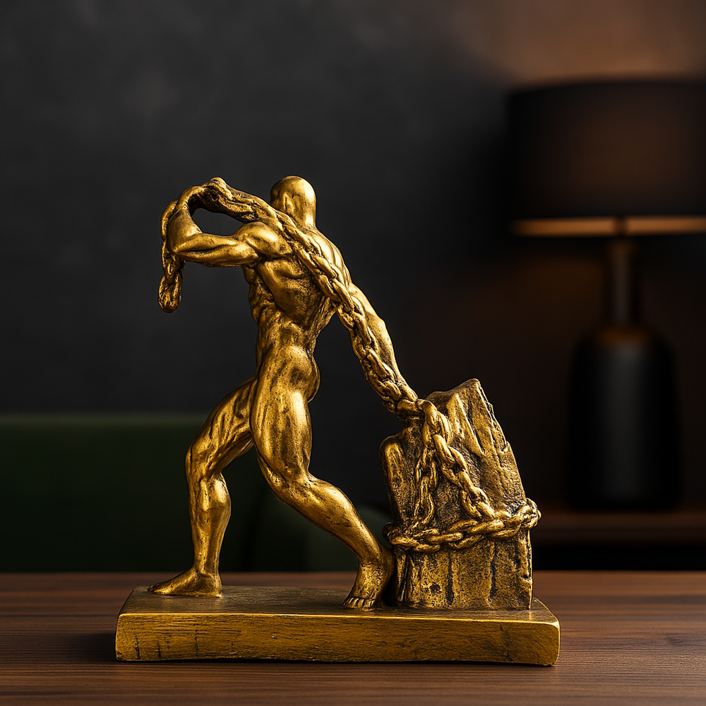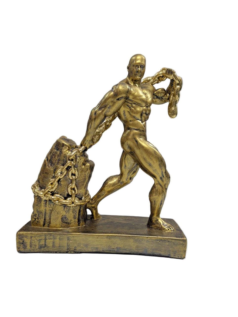 Crafted from high-quality resin, the statue features an antique gold finish that enhances its sculpted form, highlighting the contours and muscle definition with remarkable realism. The rugged texture of the chain and stone block adds depth and artistry to the design, making it a visually captivating centerpiece.