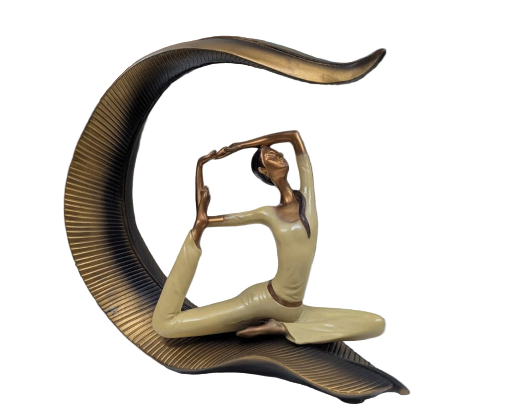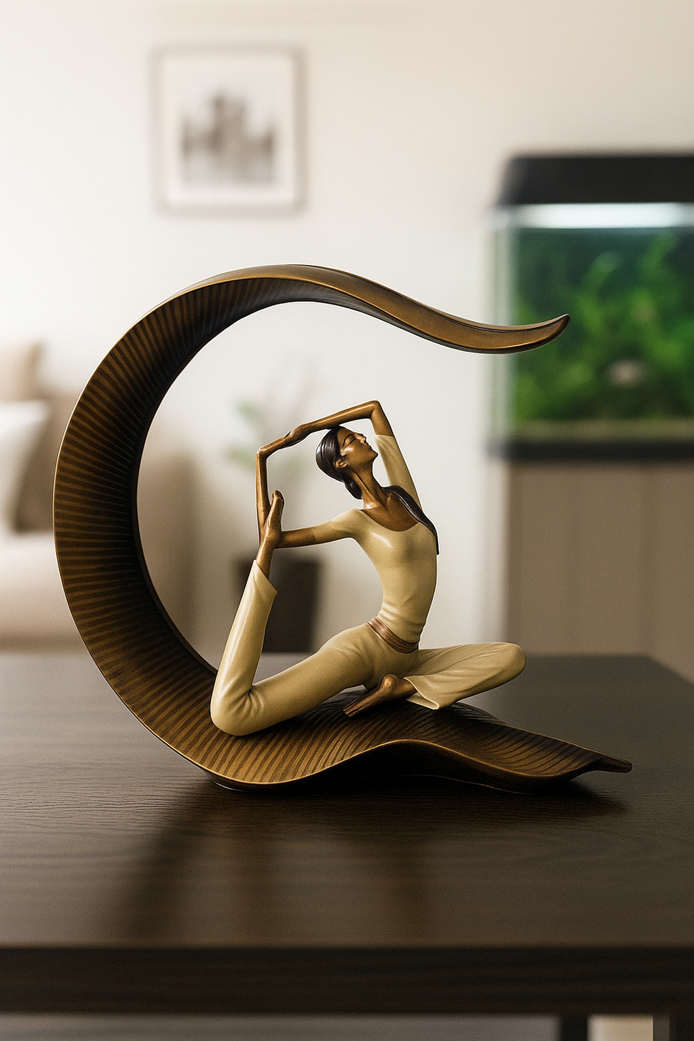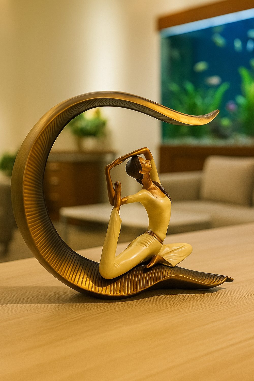 The figurine captures a golden-yellow hue of body and is presented in a graceful stretch pose, curved beautifully in the sweeping crescent of the outer form, which retains precise tooling through ridges and metallic gradients that brings a modern approach to ancient art practice. Whether you're creating a little nook for meditation, a centered display in your living room, or a home office desk accent, this functional yoga sculpture will accentuate meanings of sophistication or symbolic elegance.