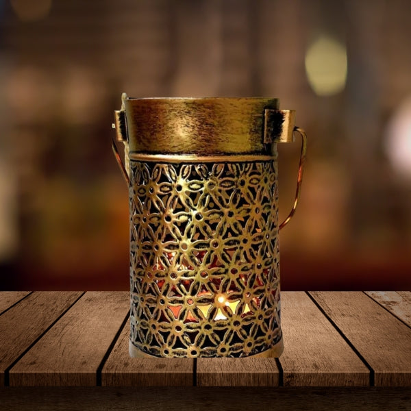 This handcrafted beautiful hanging metal Lota candle holder is a stunning piece of home decor that combines traditional craftsmanship with a touch of elegance. Made from high quality metal, this antique inspired lantern features intricate detailing, adding a unique and rustic charm to any space. The design showcases a delicate, yet sturdy, structure with a Lota (traditional pot shaped) base that acts as the perfect holder for your candles.