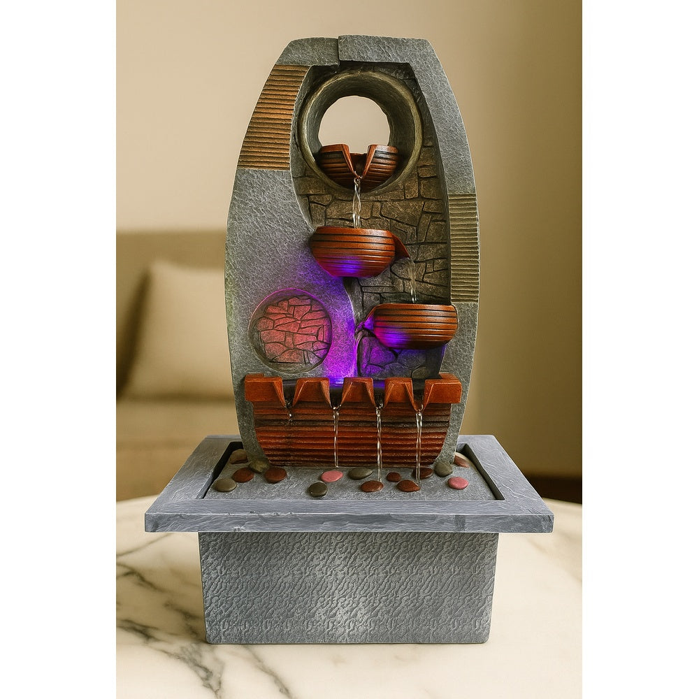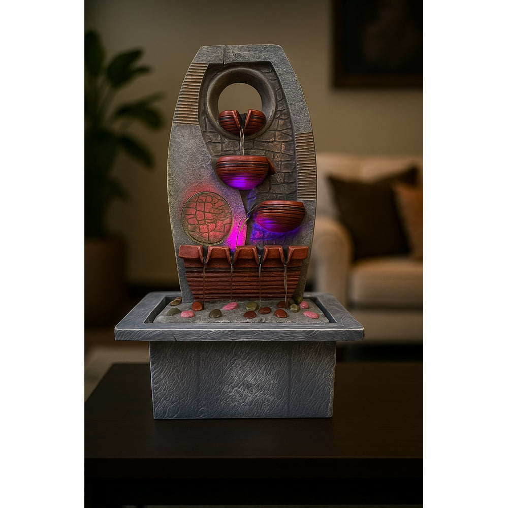 The Indoor Tabletop Water Fountain Decor Showpiece from DNA eStore is a premium polyresin multi-tier bowl fountain (Height: 61 cm) with built-in LED lights and gentle cascading water. Ideal for living rooms, meditation spaces or office desks, it adds elegance with stone-textured finish, calming sound, and positive energy through Feng Shui design.