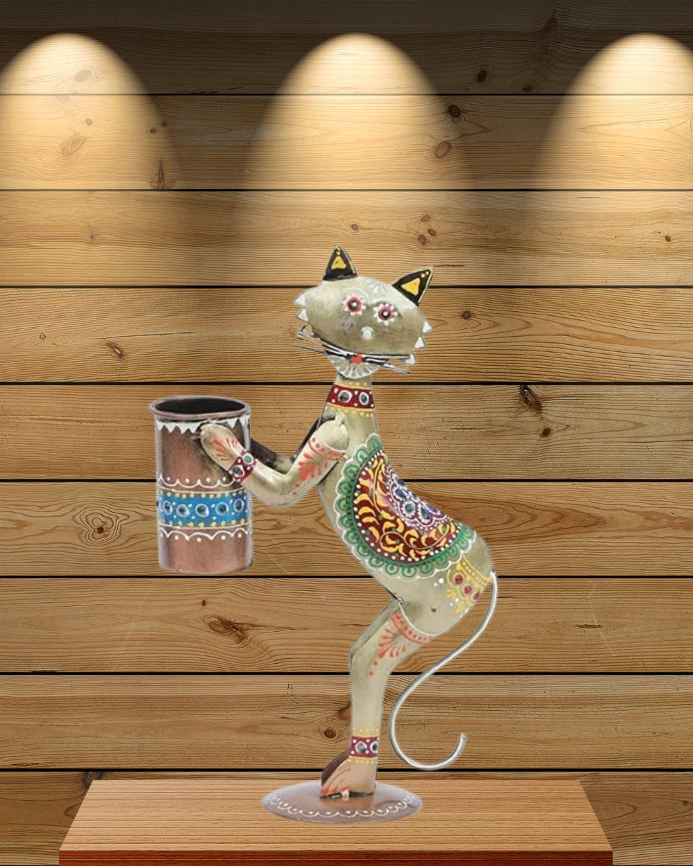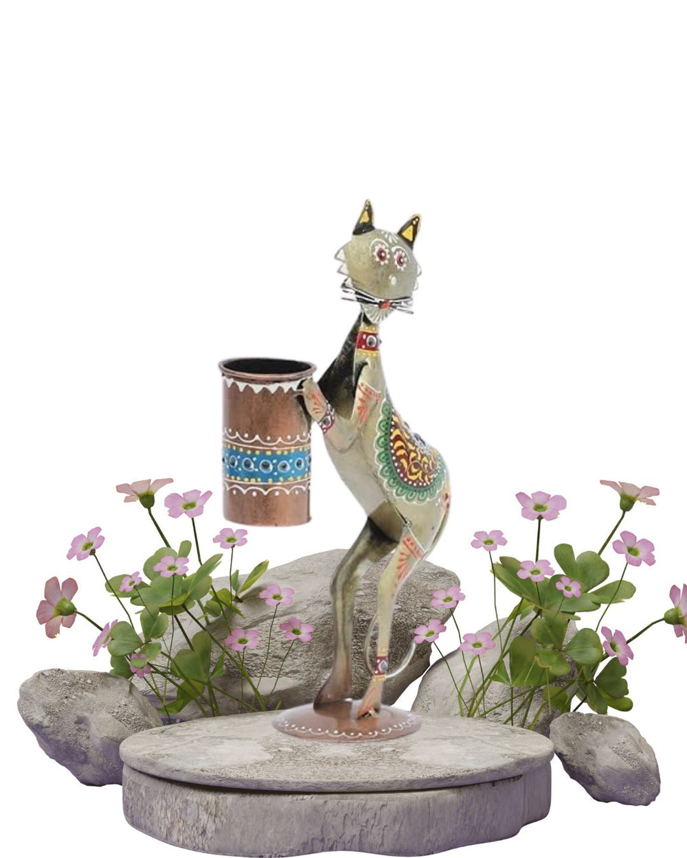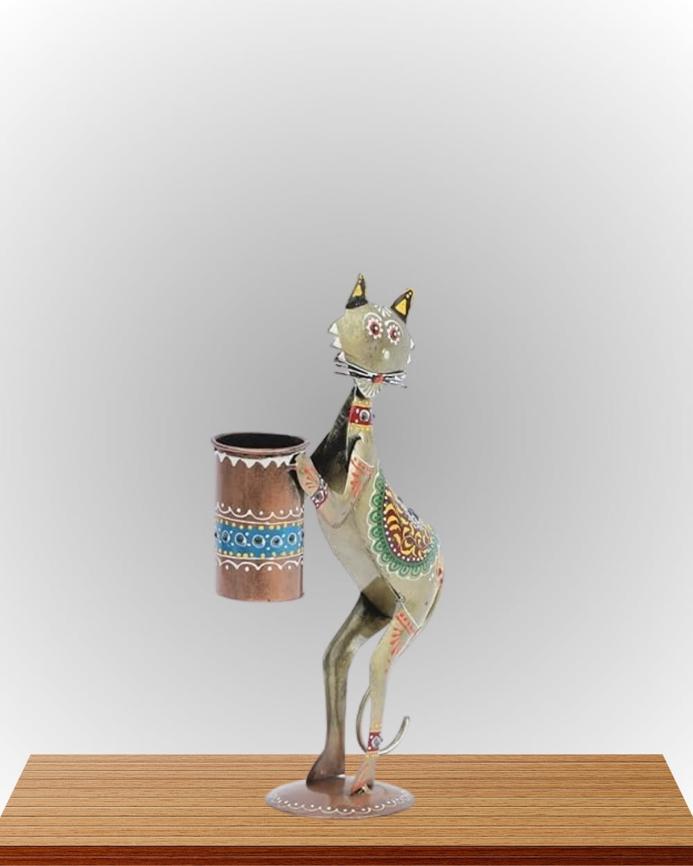 Add a touch of whimsy and charm to your workspace or home d cor with this Iron Cat Holding a Pen Holder Showpiece. This handcrafted piece features a playful cat figurine made from durable iron, cleverly designed to hold a pen or small accessories. Hand painted with care, it brings personality and artistic flair to any desk, shelf, or tabletop. nPerfect for cat lovers and fans of quirky, artistic d cor, this showpiece blends function with creativity making it both a conversation starter and a useful organizer.
