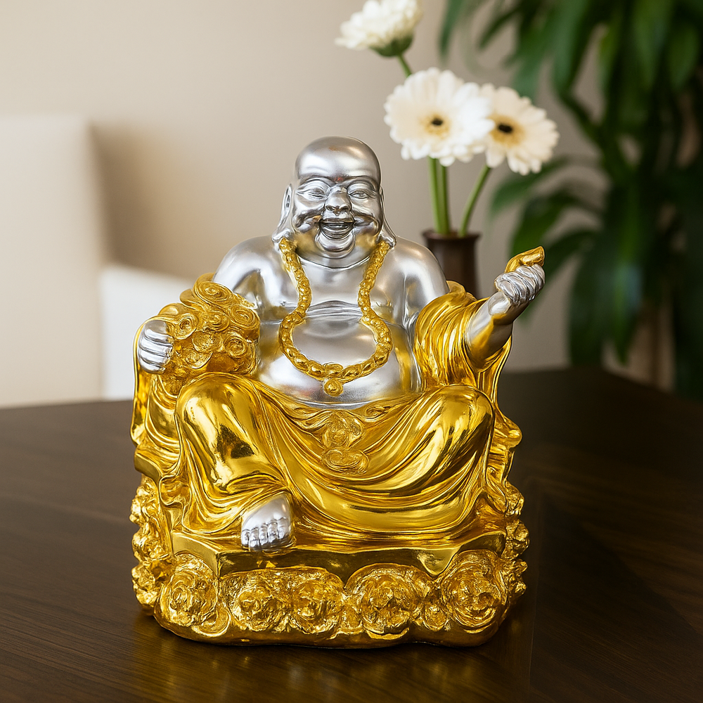 The laughing Buddha statue is made of high-quality resin that is both durable and easy to clean. Its refined completion and rich detailing ensure it remains a centerpiece of your decor for years.