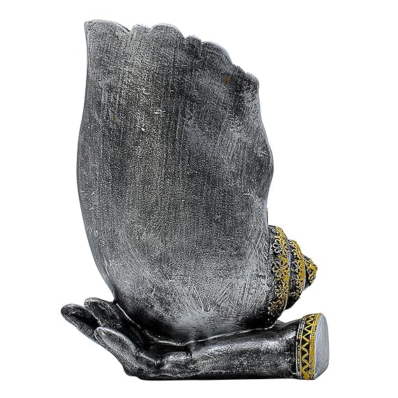 Invoke blessings and spiritual energy into your home with this divine Lord Ganesha Statue seated gracefully on a palm hand. Handcrafted with care, this unique design features a radiant gold and red finish, symbolizing protection, wisdom, and prosperity. this sacred figurine is perfect for pooja rooms, spiritual corners, living rooms, or as a housewarming gift. The palm symbolizes divine support and shelter, making it a meaningful and eye catching addition to any decor.