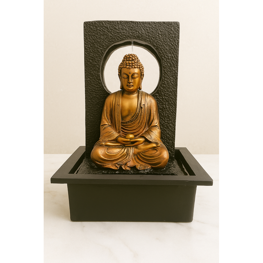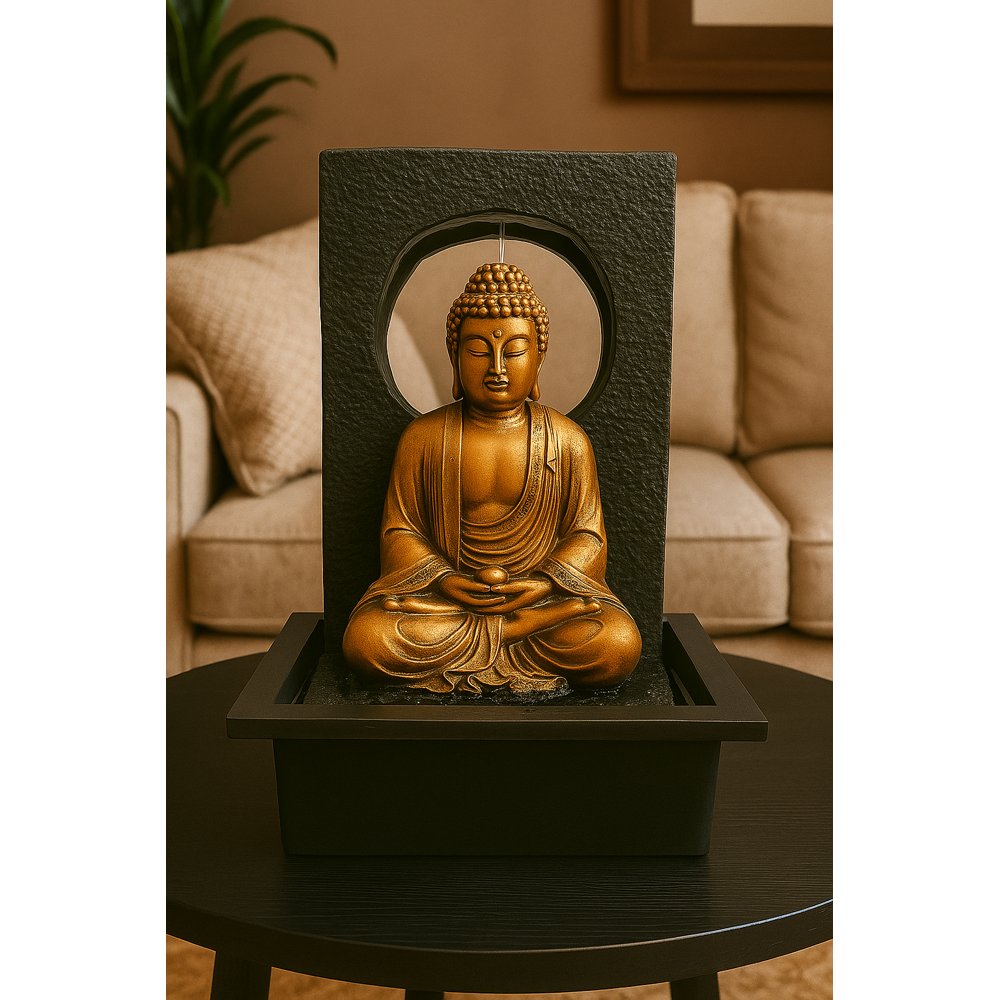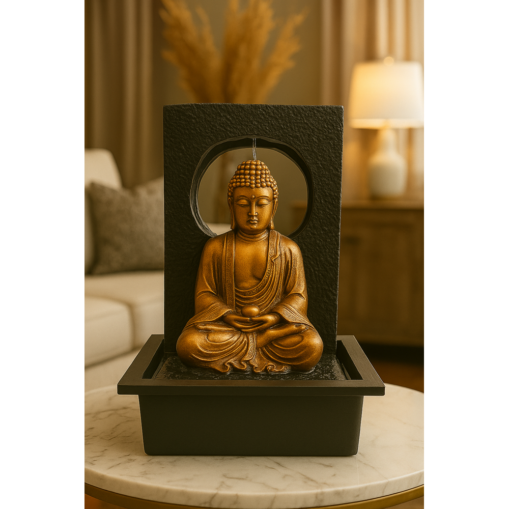 Meditation Buddha Premium Showpiece: a golden resin Buddha tabletop fountain that blends spiritual décor with modern design. Ideal for stress relief, meditation spaces, home or office décor. Rs. 3,199. School-worthy gift for wellness and mindfulness lovers.