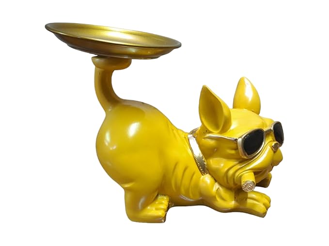 This dog platter on tail showpiece is both cute and useful. The way the platter rests on the raised tail of the dog gives it personality, and it's great for keeping small items organized—keys, coins, accessories. Made of durable polyresin, it fits nicely on a desk, bedside table, or hallway shelf. It’s a simple piece with enough charm to make everyday routines a bit more fun.