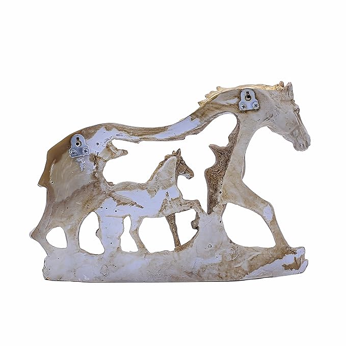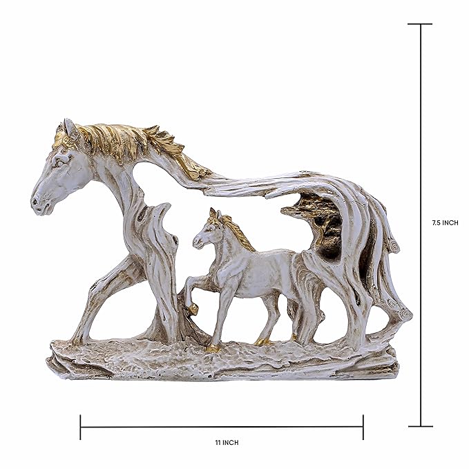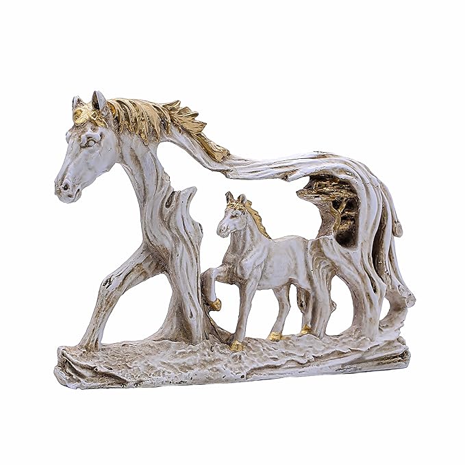 Enhance your home with the majestic charm of this Polyresin Horse in Horse Statue in a stunning Pearl White and Golden finish. Symbolizing power, speed, and grace, this intricately designed figurine features a unique "horse within a horse" concept that adds artistic flair to any space. nCrafted from high quality polyresin, this showpiece measures 7.5 x 11 inches, making it an ideal centerpiece for your living room, study, office desk, or entryway d cor. The elegant pearl and gold tones give it a luxurious touch, making it a perfect gift for housewarming, weddings, anniversaries, or festive occasions.