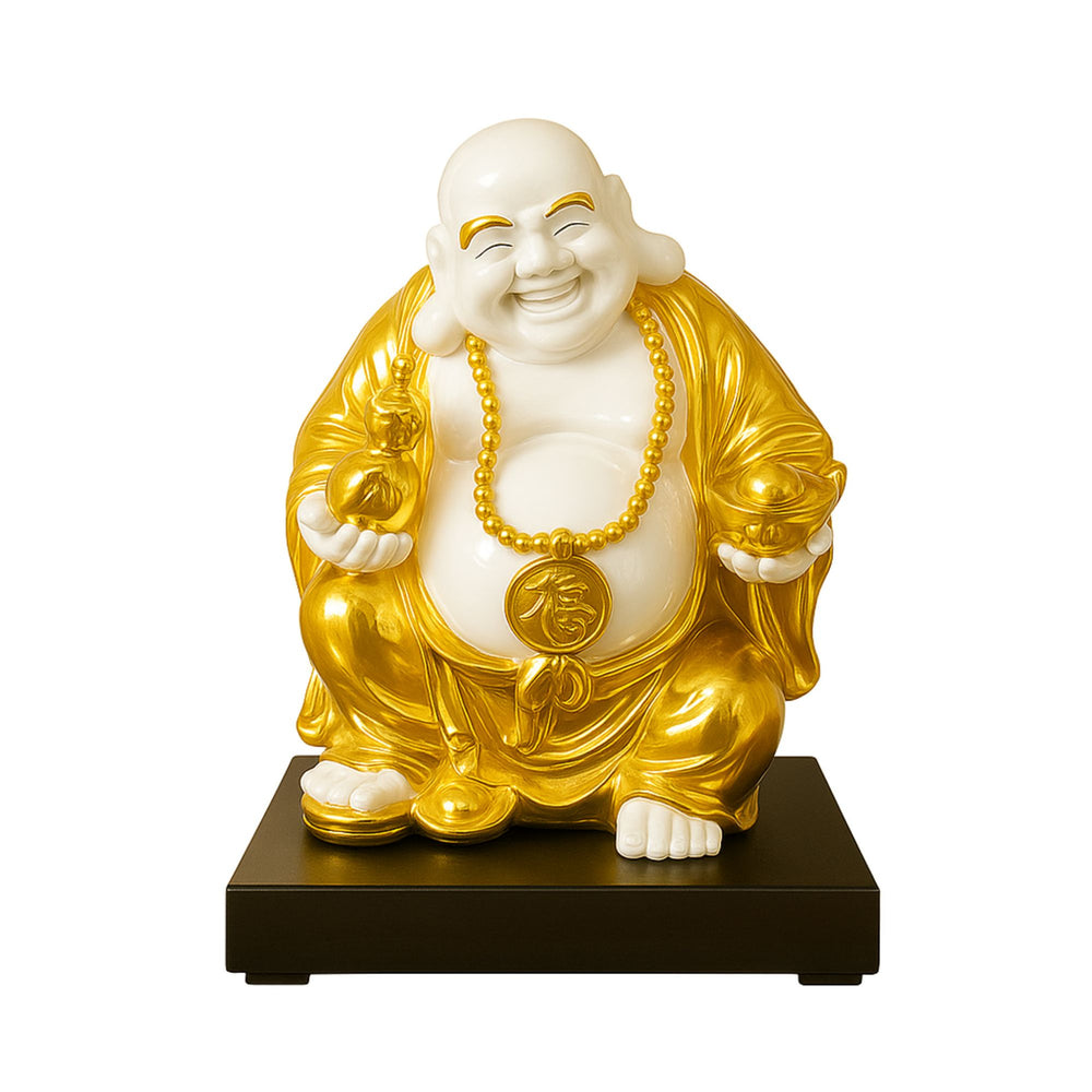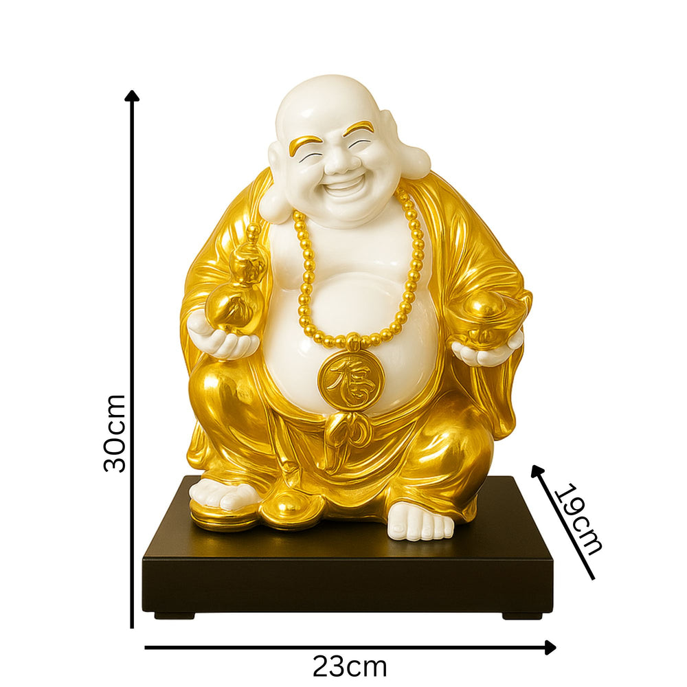 The Golden Potli Buddha Decor Showpiece can enhance your home or office with its beauty and is symbolic of happiness, prosperity and wealth. This Laughing Buddha holds a potli (a bag of wealth) and represents wealth, lightness of being, and positivity .
